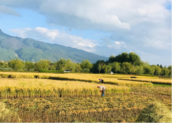 深秋的色泽,在鹤庆有着格外写意的表述。大片大片的稻田里,金灿灿的稻穗是收获的颜色;秋色尽染的枝叶是诗意的浮现;朝霞灿烂,晚霞瑰丽,皆是鹤庆秋天最动人的一面。