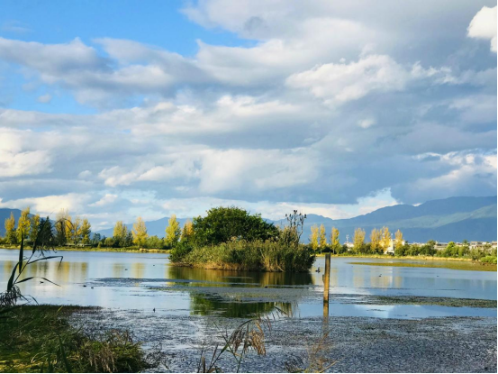 秋水深沉,恰似纯净无瑕的眼眸,映着碧蓝苍穹与惬意流云,呈现出一片梦幻的蓝色。泛黄的蒲苇,低垂的柳丝,被秋风吹拂得微微摇晃,像是耳畔细语,唯有亲身来邂逅,才知那水云之间,水乡鹤庆的柔情。