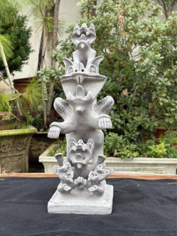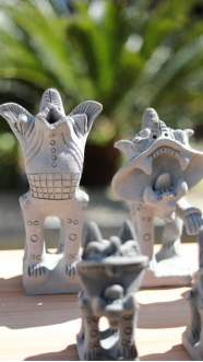 1962年,郜金福出生于鹤庆县金墩乡赵屯村北班榜自然村。自幼耳濡目染,7岁的郜金福便跟着父亲捏制瓦猫,16岁正式拜师,成为家族第七代传人。他深谙瓦猫制作的精髓:无固定模型,全凭手工塑形。从揉泥、塑形到刻花、烧制,每一道工序都需匠心独运。郜金福的突破在于将传统瓦猫从建筑构件升华为艺术品。他大胆创新,将瓦猫体型增大,造型夸张,创造出200余种形态的瓦猫,同时,突破传统单色限制,创新出彩绘镶嵌工艺,使瓦猫兼具防水功能与艺术观赏性。这些形态各异的瓦猫包括塔猫、六福猫、团圆猫、八方猫、墩猫、飞天猫、双头猫等多个品种,个个神态各异,充满灵气。