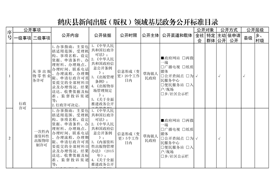 鹤庆县草海镇新闻出版(版权)领域基层政务公开标准目录