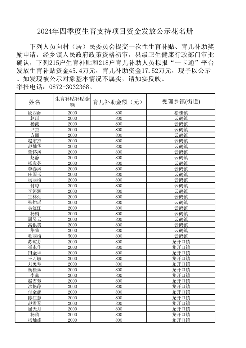 2024年四季度生育支持项目资金发放公示花名册
