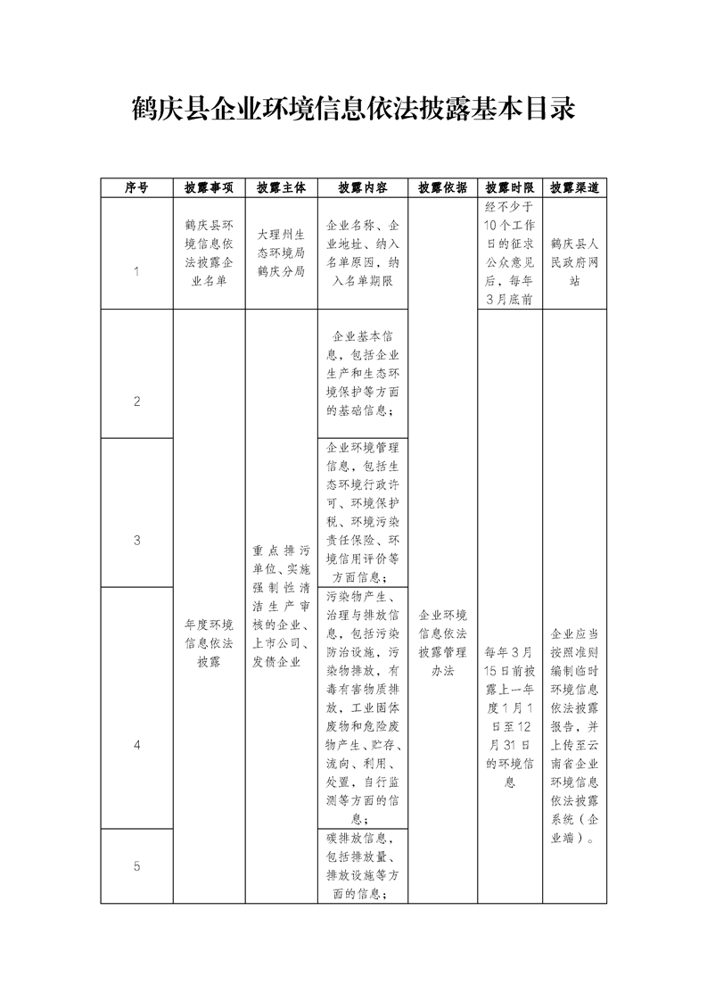 鹤庆县企业环境信息依法披露基本目录