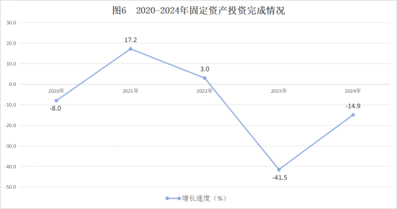 全年规模以上固定资产投资完成额比上年下降14.9%。其中:500万元以上项目投资完成额下降13.5%,房地产投资完成额下降46.4%,工业项目投资完成额增长28.1%,能源以外工业投资完成额增长115.8%,能源工业投资完成额增长18.9%。