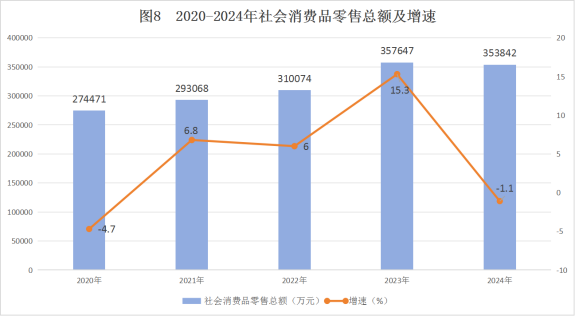 按经营地统计,城镇消费品零售额233215万元,比上年下降1.2%;乡村消费品零售额120627万元,下降0.8%。按消费形态统计,商品零售297183万元,下降1.7%;餐饮收入56659万元,增长2.5%。