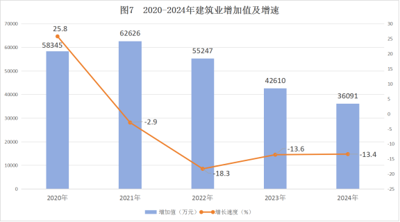 全年完成建筑业增加值36091万元,比上年下降13.4%。