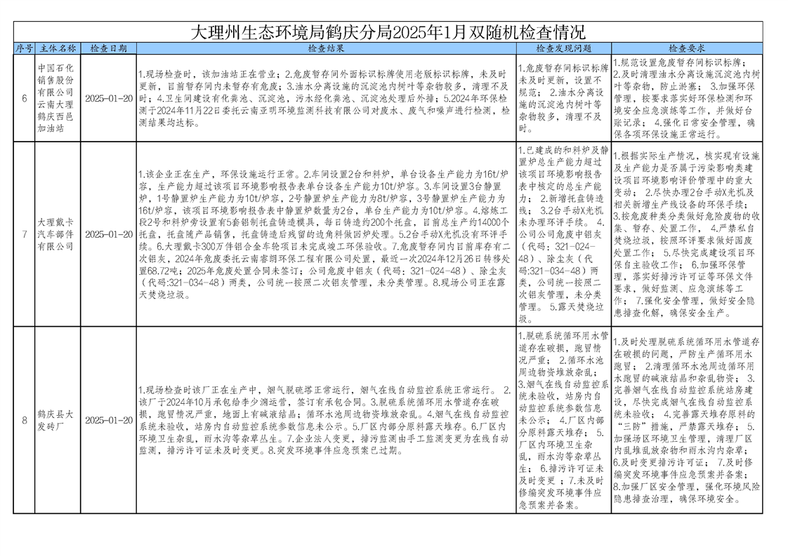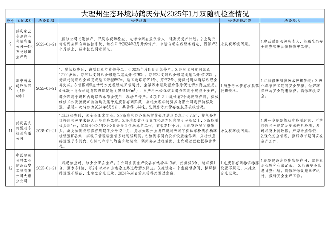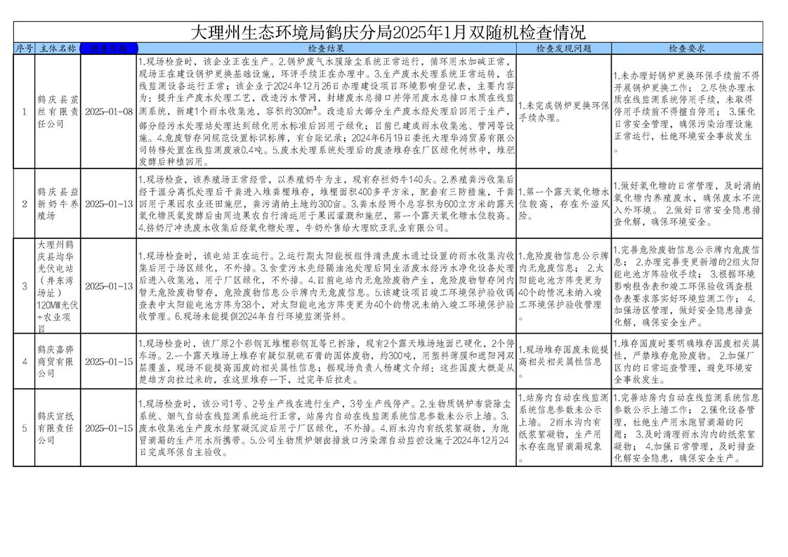大理州生态环境局鹤庆分局2025年1月双随机检查情况(公示)