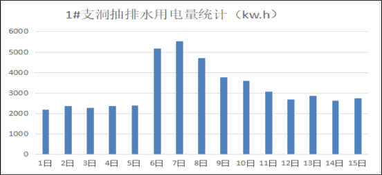 在事故发生前的时段大量雨水向下入渗沿岩溶裂缝、溶洞管道等构造通道形成地下暗流,于地势低矮、排泄通畅处逸出。项目经理部以往未对隧洞内涌水量进行统计,但给隧洞内抽水泵安装独立电表计量抽水用电量,该段隧道6月1日至15日抽水泵合计用电量变化情况如下: