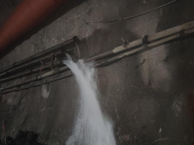 隧洞周边岩溶地质构造复杂,穿越数个导水富水断层,洞位埋深300~468m,隧洞处于地下水水位之下,施工中有大量的地下水涌出,采取集水井收纳后,在隧道顶壁安装三根排水导管抽排至已衬砌支护段后,又集中外排,见照片5。
